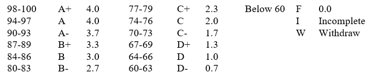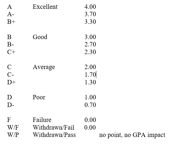 The Registrar translates letter grades to grade points in accordance with the table shown later in this section.